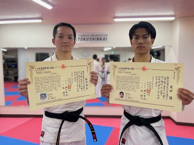 先週末に黒帯と賞状が到着し、植村誉夫初段、角田陽初段に授与しました。真新しい黒帯を締めた気持ちはいかがでしょうか。また今後に向けて目標も新たに、初心に帰った感覚でもあるでしょう。この感覚を忘れることなく、黒帯に相応しい強さと人格をもって...